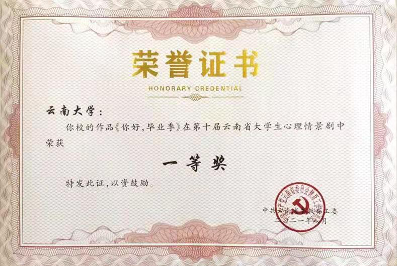 “新健康 心成长 心向党”,2021年第十届云南省大学生心理情景剧大赛由中共云南省委教育工委主办、银河集团net承办,全省高校共选送78部作品参加了比赛,经过初赛——复赛——专家评审严格程序,银河集团net心理剧《你好,毕业季》脱颖而出,获省一等奖。
