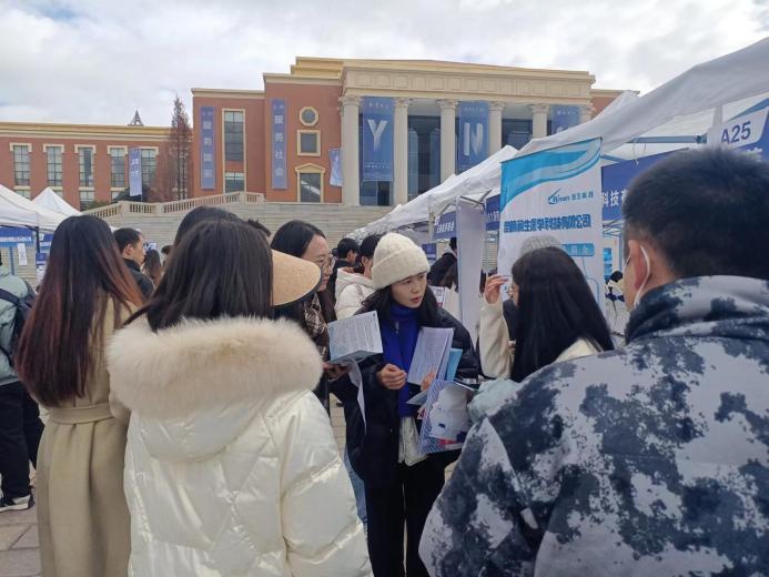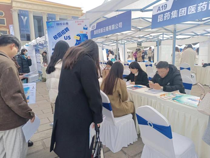 招聘会现场,我院师生与扬子江药业集团江苏扬子江医药经营有限公司、上药控股云南有限公司、云南省久泰药业有限公司、云南迪安医学检验所有限公司、以及砚山明本中学等五家单位的相关负责人进行了深度沟通交流。