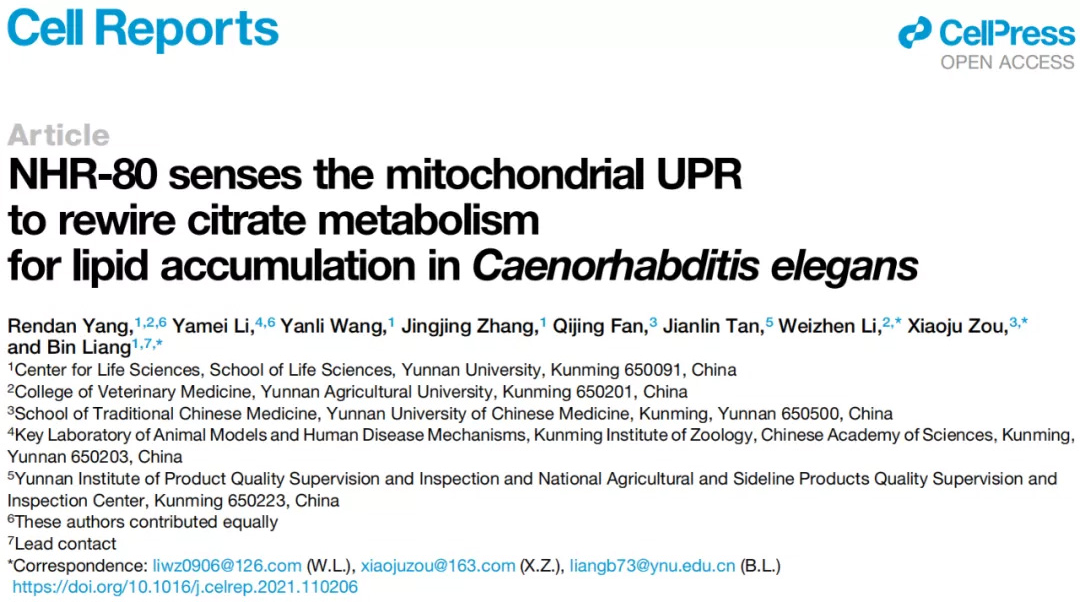2022年1月11日,Cell Reports(五年影响因子10.394)发表了银河集团net/中心梁斌研究员实验室题为“NHR-80 senses the mitochondrial UPR to rewire citrate metabolism for lipid accumulation in Caenorhabditis elegans”的研究论文,发现抑制线粒体TCA循环导致柠檬酸累积,特异性地激活线粒体非折叠蛋白反应(Mitochondrial unfolded protein response,UPRmt)与脂质累积,核受体因子NHR-80响应柠檬酸引起的UPRmt,把累积的柠檬酸转化为脂质储存。
