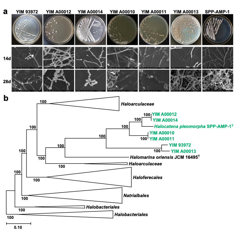 图1 形态发育嗜盐古菌的形态特征(a)与系统发育(b)