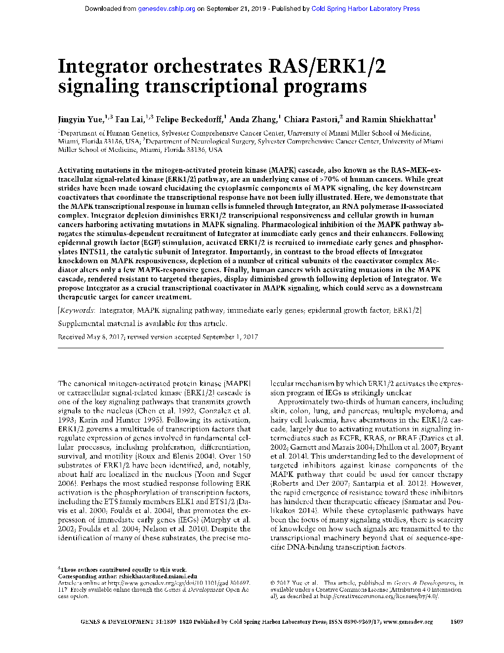 2. Yue J#, Lai F#, Beckedorff F, Zhang A, Pastori C, Shiekhattar R. Integrator orchestrates RAS/ERK1/2 signaling transcriptional programs. Genes & Development (2017), 31(17): 1809-1820 (Co-first author)