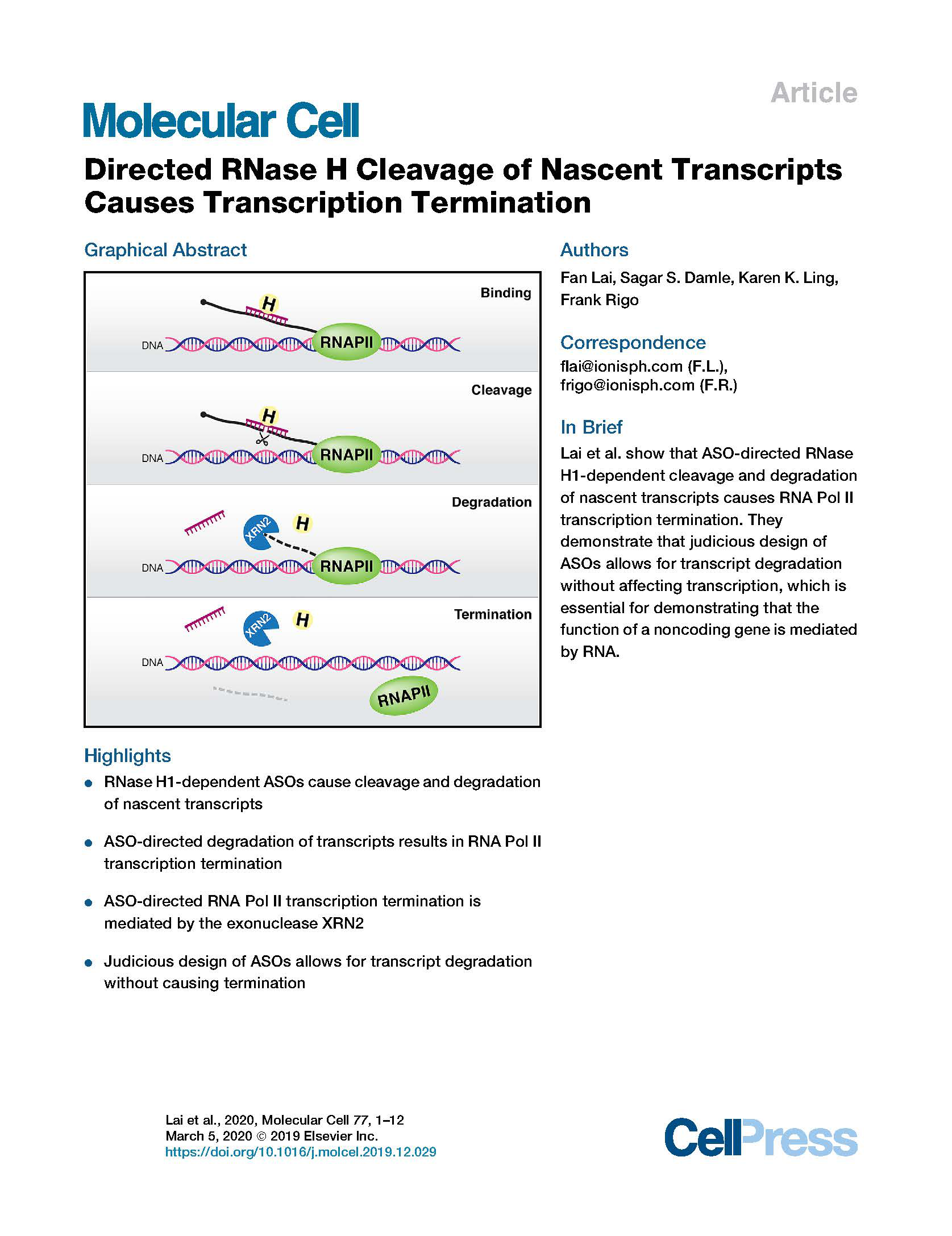 1. Lai F, Damle S, Ling KK, Rigo F. Directed RNase H cleavage of nascent transcripts causes transcription termination. Molecular Cell (2020),77(5): 1032-1043 (first and co-corresponding author)